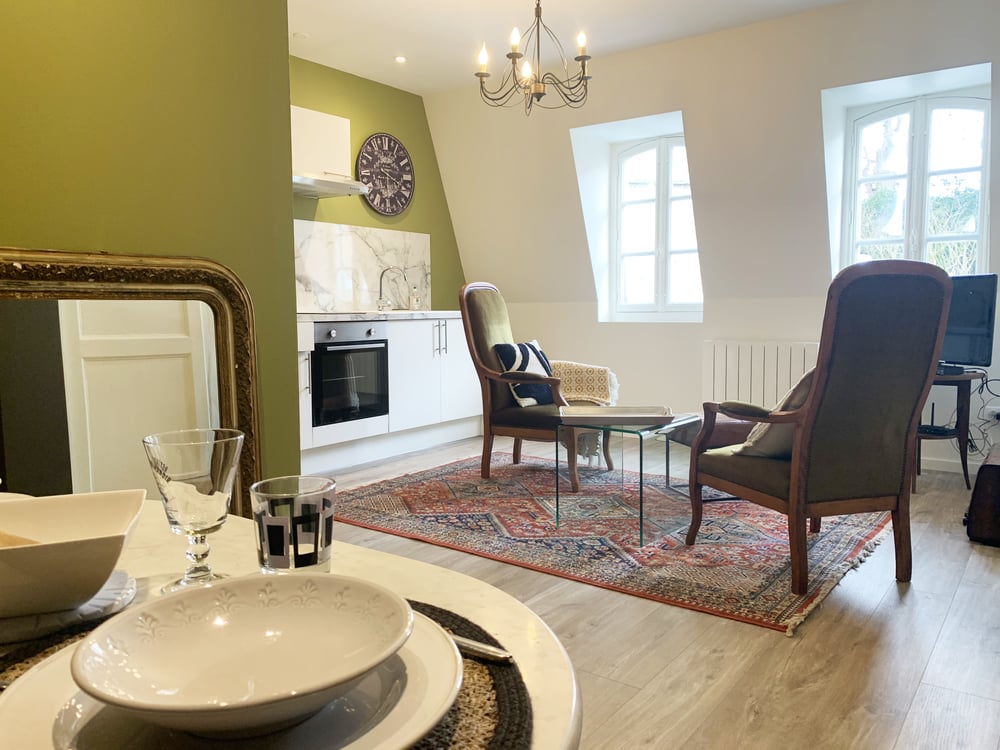 This beautiful luxury apartment for two people will be the perfect place to come and spend an unforgettable moment in our beautiful city of Chartres. The apartment is located in the city center near the underground parking lot Qpark cœur de ville where we have a subscription to facilitate your arrival. The accommodation consists of a bedroom with a bed of 160cm, as well as a living room with a dining table for two people, a sitting area with its two armchairs and television and an open kitchen. The bathroom has a shower and a washbasin and a toilet.